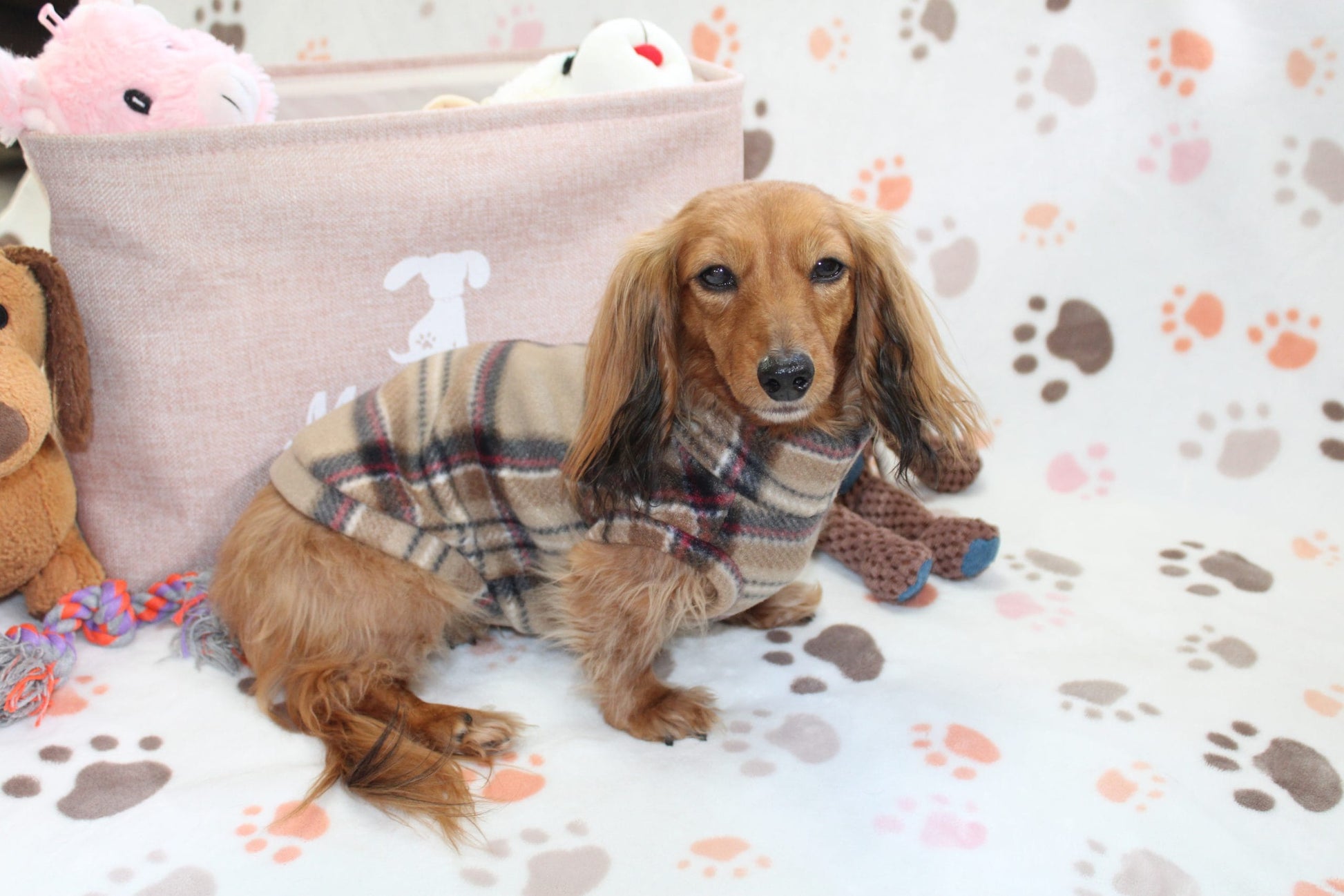 Falko Brown Plaid Fleece Dachshund Sweater - Measurements in item description